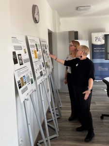 Dr Martina Ireinová i prof. Dorota Rembiszewska oglądają wystawę w siedzibie IS PAN. Fot. Kinga Capik.