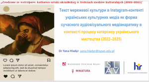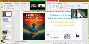 Dr Yana Hladyr wygłosiła godzinny referat pt. „Zrodzone ze wstrząsów: teksty kultury sieciowej jako świadectwa procesu katharsis w sztuce ukraińskiej (2022–2025)”, będący częścią realizowanego przez nią projektu badawczego.