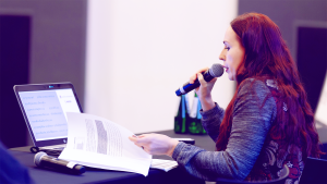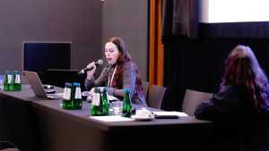 Dr Yana Hladyr podczas wygłaszania referatu. Fot. Przemysław Walczak.