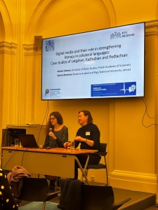 W konferencji wzięły udział trzy osoby z IS PAN. Prof. Nicole Dołowy, główna organizatorka konferencji, wygłosiła wraz z prof. Sanitą Marteną z RTU Rēzekne Academy referat „Digital Media and their Role in Strengthening Literacy in Collateral Languages: Case Studies of Latgalian, Kashubian and Podlachian” poświęcony oddolnym praktykom piśmiennym w trzech językach kolateralnych. Dr Piotr Szatkowski, członek sieci COST Action PLURILINGMEDIA i członek komitetu organizacyjnego, przedstawił referat „AI-Generated Kashubian Voices: Community Perspectives on Concept and Implementation”, w którym odniósł się do wyników autorskiej ankiety na temat postaw i ideologii językowych związanych z rolą AI w produkcji w języku dominującym – polskim oraz mniejszościowym – kaszubskim. Z kolei dr Olha Tkachenko w referacie „Dialects and Regional Languages on Ukrainian YouTube: Representation and Interaction” odniosła się do sposobu przedstawiania języków regionalnych w ukraińskich mediach społecznościowych.