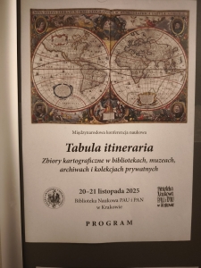 W dniach 20–21 listopada 2025 r. z inicjatywy pracowników Biblioteki Naukowej PAU i PAN w Krakowie w auli gmachu Polskiej Akademii Umiejętności w Krakowie odbyła się międzynarodowa konferencja naukowa pt. „Tabula itineraria. Zbiory kartograficzne w bibliotekach, muzeach, archiwach i kolekcjach prywatnych”.