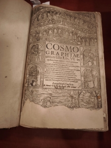 Dr Wojciech Mądry podczas wygłaszania referatu w auli PAU w Krakowie. Fot. archiwum prywatne.Uczestnicy konferencji podczas prezentacji map w zbiorach Archiwum Narodowego w Krakowie. Fot. archiwum prywatne.Plakat konferencji. Fot. archiwum prywatne.Strona tytułowa „Kosmografii” Sebastiana Münstera z połowy XVI w. ze zbiorów Biblioteki Naukowej PAU i PAN w Krakowie. Fot. archiwum prywatne.