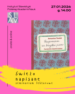 Serdecznie zapraszamy na pierwsze w 2026 roku seminarium lekturowe z cyklu „Świeżo napisane”, które odbędzie się 27 stycznia (wtorek) o godz. 14.00 w sali konferencyjnej Instytutu Slawistyki PAN (ul. Jaracza 1, piętro V) oraz online.
